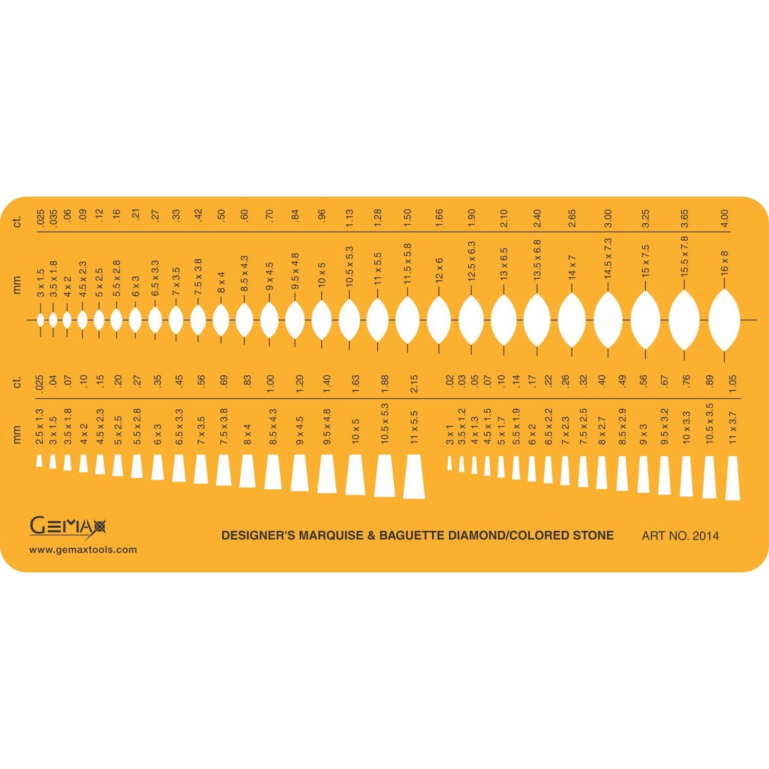 The Jewelry Template – Marquise & Baguette #2014 is a professional jewelry design and drawing template created for accurately measuring and sketching marquise-cut and baguette-cut diamonds and colored stones. This designer’s stone size guide is an essential tool for jewelers, goldsmiths, jewelry designers, and students involved in custom jewelry design.
